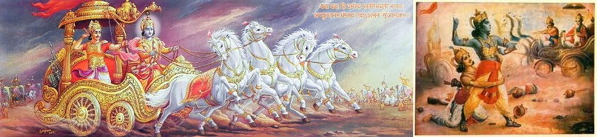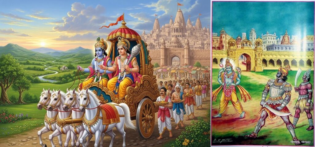 Krishna returned to the battlefield of Mathura. His plan had succeeded for some time. Seeing that Jarasandha’s army had chased the soldiers of Kalayavana into Mathura and become scattered, they were astonished. Before they could react, the soldiers of Kalayavana began attacking them. They could not identify the banner of Mathura or of Jarasandha. They assumed that the Mathura army was attacking them from behind. Both armies became engaged in fierce carnage.