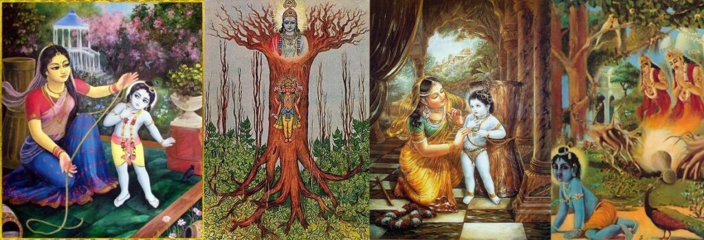 Yashoda decided to tie Krishna to a heavy mortar so he wouldn’t run away again. But something strange happened. Every rope she tried was just two fingers too short. She tied more rope, and it was still short! Only when Krishna himself agreed did the rope finally fit, and Yashoda tied her little boy. The gopis who were watching laughed and teased Yashoda, saying that all the ropes in the house had been used just to tie one naughty child.