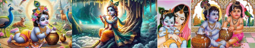 All the village women, the gopis, could not stop thinking about Krishna. They would finish their housework as quickly as possible just to come near Nanda’s house. Everyone wanted to hold Krishna, feed him, and kiss him. They would tempt the children by saying, “Bring Krishna to my house, and I will give you sweets!” The children would take Krishna and Balarama to the gopis, who would feed them butter, curd, and treats with so much love. Some even held Krishna in their laps and fed him with their own hands.