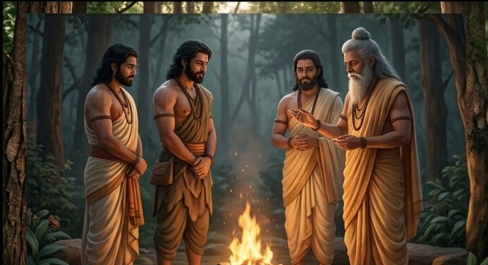 One evening in the Kamyaka forest, as the sun dipped low and the sky glowed with fading gold, the Pandavas sat together near their hermitage. A sacred fire burned gently, its flames dancing in rhythm with the quiet winds.