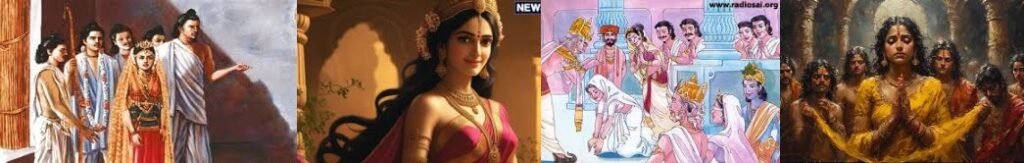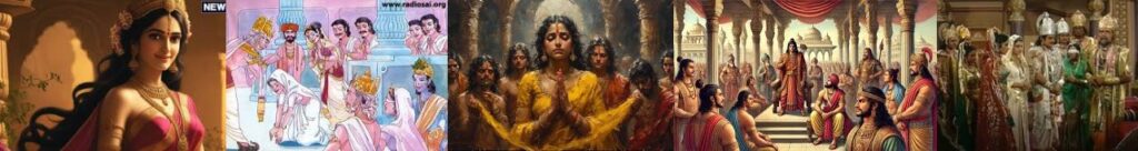 After bowing to her mother, when Panchali came out to sit in the chariot with Kunti, Padmavati, overwhelmed with emotion, embraced her daughter tightly. The garments of both were soaked with tears. The priest Dhaumya recited auspicious hymns. The sound of conches, drums, and the mahuri (a traditional wind instrument) echoed throughout the capital of Panchala.