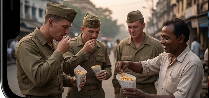 Amid this setting, Odia laborers continued their daily routines, including the consumption and sale of mudhi. The American soldiers, intrigued by this unfamiliar food, began to observe and eventually taste it. Finding it light, convenient, and surprisingly flavorful—especially with mustard oil and spices—they developed a liking for it.