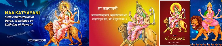 On the sixth day of Navaratri, devotees worship the Mother as Maa Katyayani. She was born as the daughter of the great sage Katyayana, and thus came to be known as Katyayani. Resplendent in golden radiance, she rides a lion and wields a sword, shield, and lotus. She has four arms and a form that inspires courage.