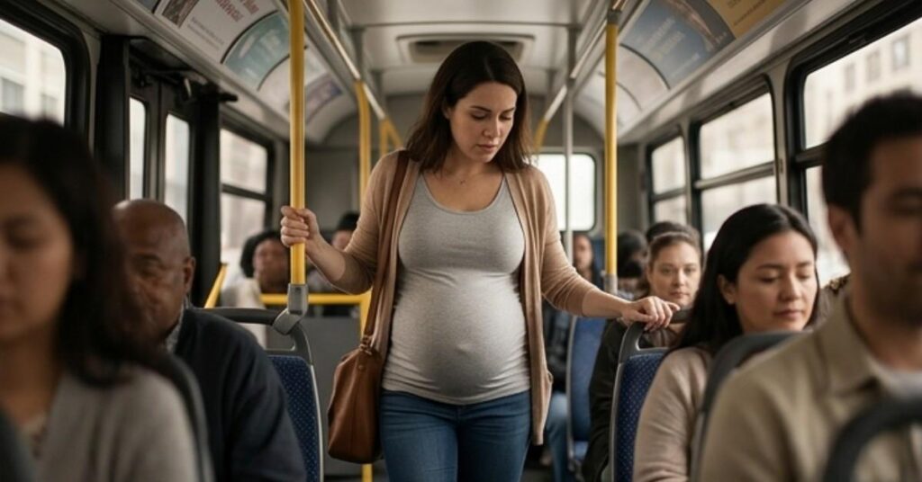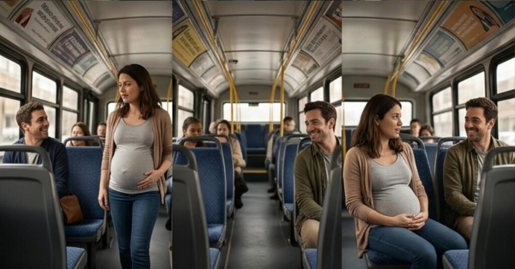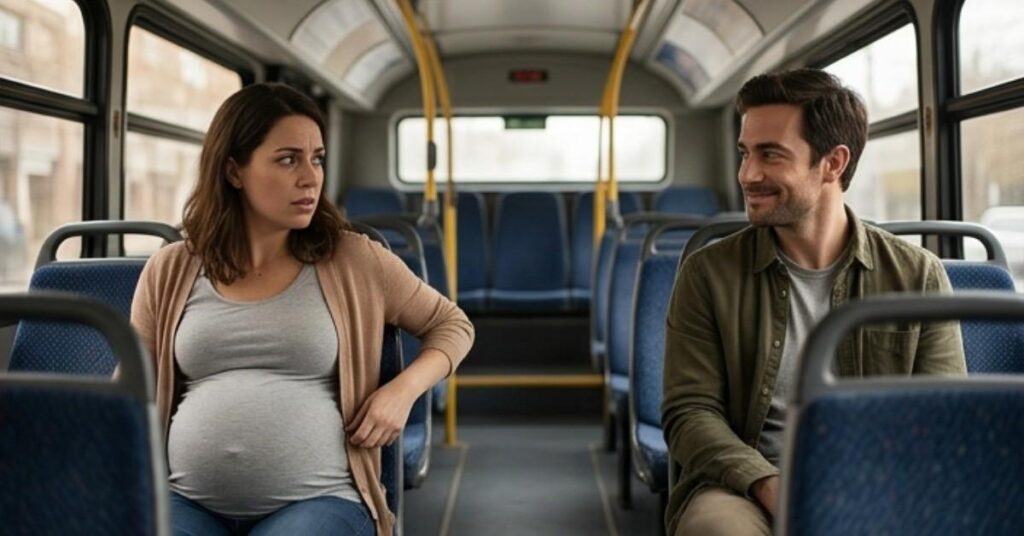 A heavily pregnant woman boarded a crowded city bus, moving carefully, her condition evident to all around her. After a brief hesitation, she found a vacant seat and settled in, relieved to rest. Across from her sat a man who, at first glance, appeared unremarkable. However, as she adjusted herself, she noticed him looking directly at her—with a faint but unmistakable smile.
