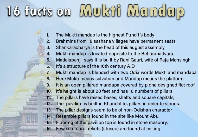 One of the most significant institutions associated with the Jagannath temple is the Mukti Mandapa, a platform of salvation situated inside the temple complex, near the Adi Nrusingha temple on the southern side.