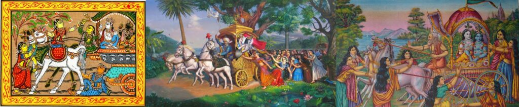 As Krishna’s chariot entered Vrindavan, thousands of cows ran toward Him lowing in joy. Their bells jingled sweetly. Krishna leapt from the chariot and embraced them. Calling them by their names, He stroked their faces as they rubbed lovingly against Him.