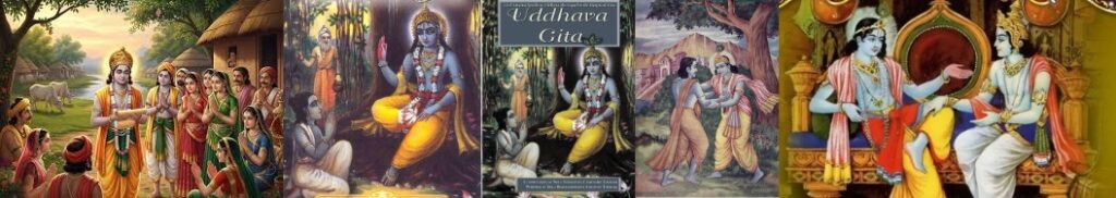 Before his departure, Radha gave Uddhava her head ornament and a jeweled necklace for Akrura as offerings for Krishna. The other gopīs, too, placed various gifts in Uddhava’s hands. Taking leave of all the residents of Vraja, Uddhava returned to Mathura.
