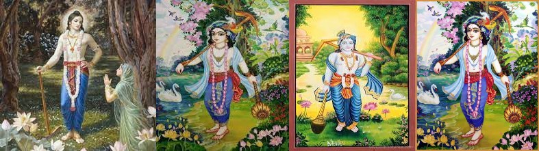 Once His parents calmed, Krishna went to see Radha. She had decorated her home for His arrival. After their sweet reconciliation, they went together to the forest groves.